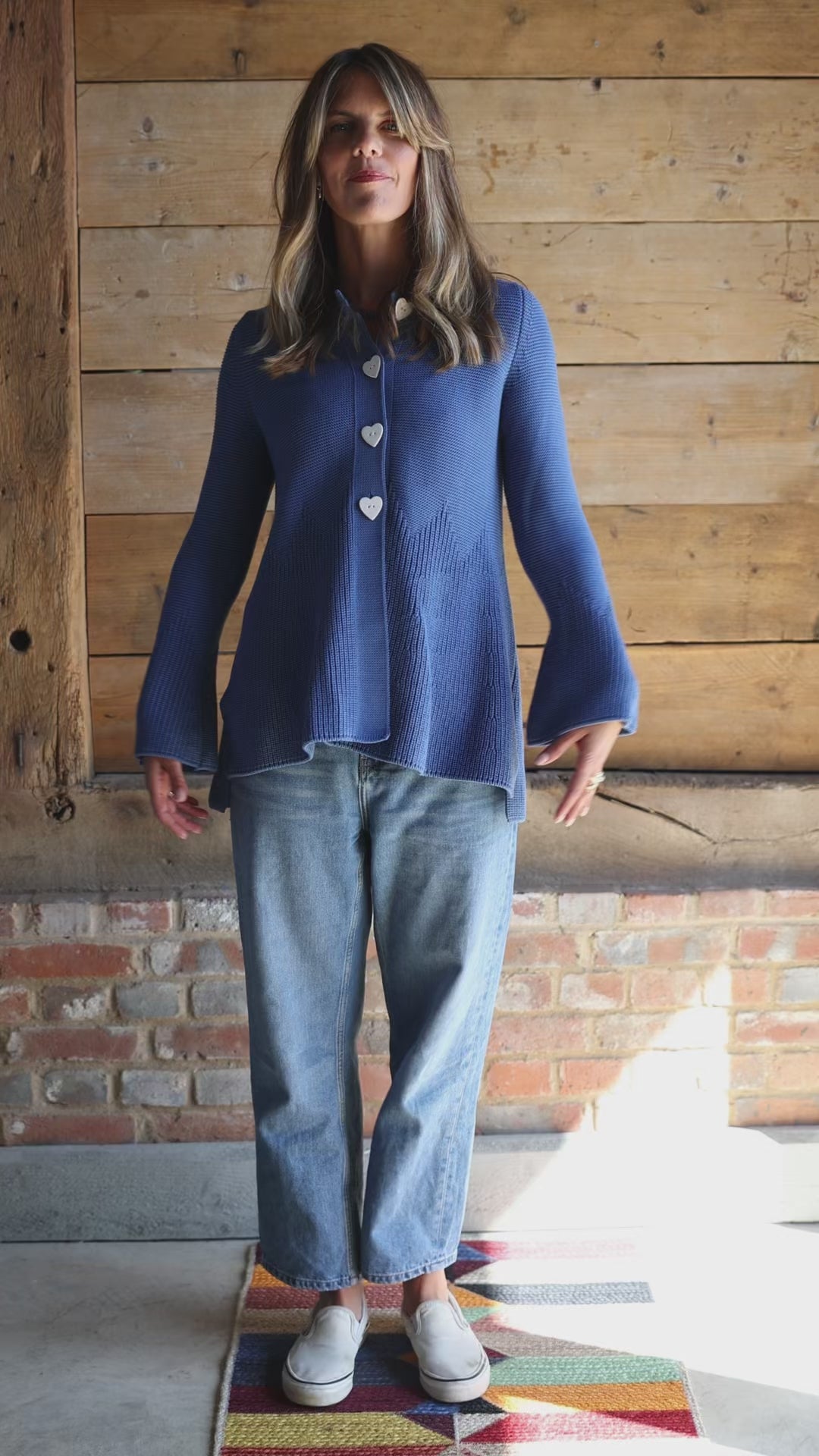 The Cotton Teddy Jacket is fastened with playful Heart ceramic buttons, each one made by hand in a local Cotswolds studio. Choose between White, Blue or Navy Heart buttons