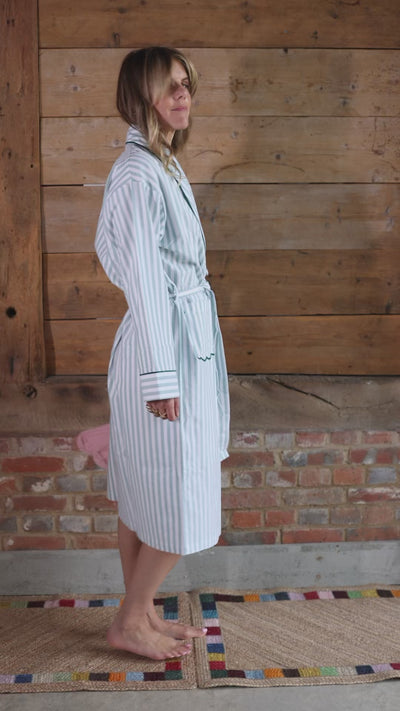 Offering a versatile cover-up, using a beautifully soft brushed cotton fabric. This striped robe features elegant long sleeves, two useful scalloped pockets and a self-tie waist. Effortless style and timeless appeal.