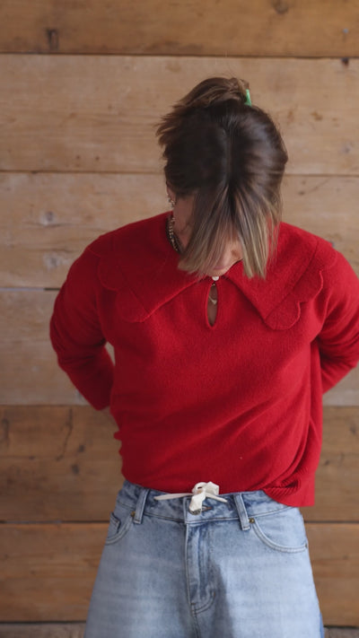 This jumper features our signature scalloped edge design at the collar and dropped shoulders for a relaxed fit. The collar slit is fastened with a stunning real mother-of-pearl button, offering versatility—it can be worn buttoned up or unbuttoned to highlight the neckline, adding a touch of glamour for any occasion. A timeless "forever heirloom" piece, this jumper is designed to effortlessly elevate your everyday wardrobe.